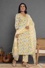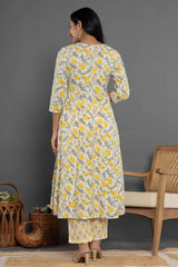 Yellow Ethnic Motifs Beads and Stones Embossed Pure Cotton Kurti Pant Set