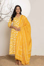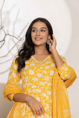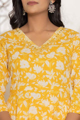 Yellow Floral Print Embroidered Pure Cotton Kurti Pant Set