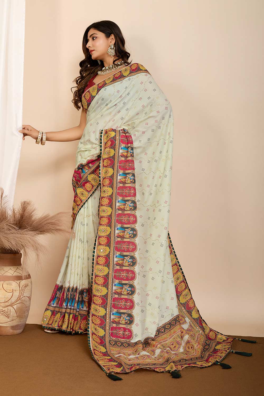 Elevate your wardrobe with our exquisite Saree, a masterpiece crafted to add timeless elegance to your style. Made from Muslin this saree offers a perfect mix of comfort and sophistication. Adorned with Printed it showcases intricate craftsmanship that speaks volumes of tradition and artistry. Perfect for Partywear this saree is a versatile addition to your collection, ensuring you stand out effortlessly. Pair it with elegant Jewelry, such as for a glamorous look. Add a Clutches or Potli Bags and complete the ensemble with Wedges & Heels , making it a perfect choice for any event. Make a statement and embrace the elegance of Saree today
