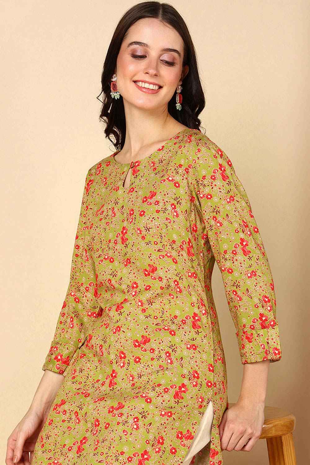 Yellow Rayon Floral Print Keyhole Neck Kurti