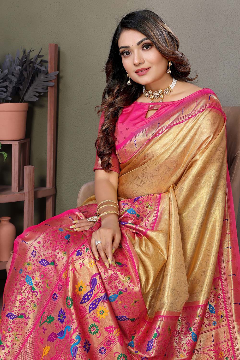 Elevate your wardrobe with our exquisite Saree, a masterpiece crafted to add timeless elegance to your style. Made from Tissue this saree offers a perfect mix of comfort and sophistication. Adorned with Woven it showcases intricate craftsmanship that speaks volumes of tradition and artistry. Perfect for Weddingwear,Sangeet,Reception this saree is a versatile addition to your collection, ensuring you stand out effortlessly. Pair it with elegant Jewelry, for a glamorous look. Add Clutches or Potli Bags and complete the ensemble with Wedges & Heels , making it a perfect choice for any event. Make a statement and embrace the elegance of Saree today